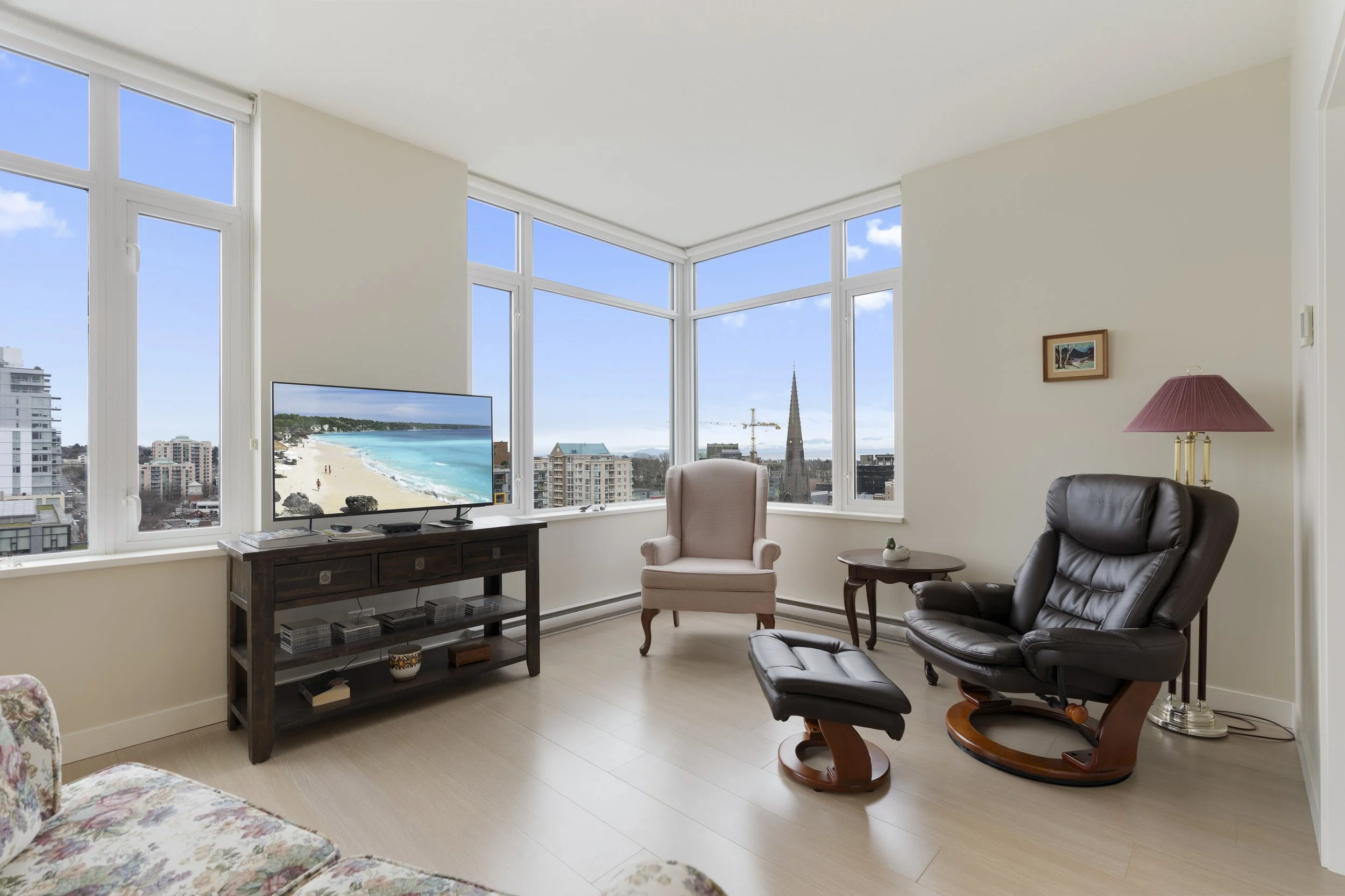 Perched high on the 14th floor of Era, this SE-facing 2-bed, 2-bath sub-penthouse offers breathtaking views of the ocean, Olympic Mountains & city skyline. Built by Concert, this steel & concrete tower is in the heart of downtown, just steps from top dining, shopping, fitness & entertainment-earning a perfect 100 Walk Score. The open-concept design boasts 9' ceilings, expansive windows, quartz counters, soft-close cabinetry & premium SS appliances. A spacious 150sqft terrace extends your living space outdoors. Thoughtfully maintained by the original owners, this unit is a dream to occupy. Residents enjoy a stylish lounge, outdoor BBQ patio & secure parking. Steps to top dining, shops, entertainment & more-this is your chance to own a stunning piece of Victoria's vibrant downtown!